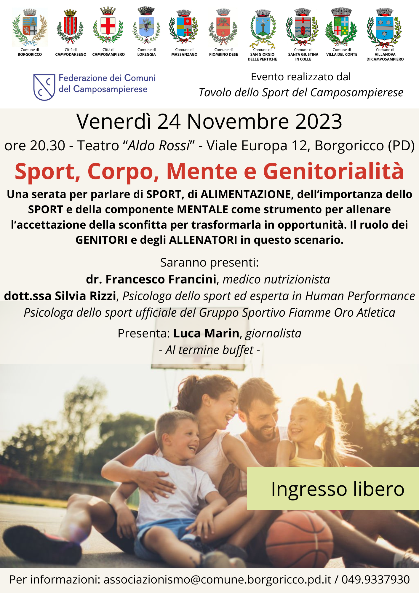 La serata sarà un’occasione per parlare di sport, da vari punti di vista e soprattutto rivolgendosi anche alle famiglie e non solo alle società sportive. I focus saranno l’alimentazione e lo sport, ma l’importanza dello sport e della componente mentale come strumento per allenare l’accettazione della sconfitta per trasformarla in opportunità, nonché il ruolo dei genitori e degli allenatori in questo scenario.
